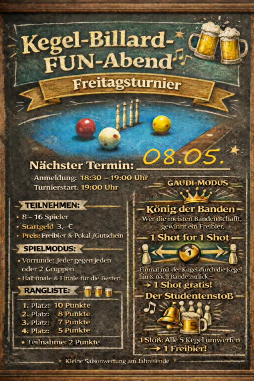 am Freitag, den 08. Mai, lädt der BC Regensburg zu einem besonderen Highlight ein: unserem Kegel-Billard Fun-Turnier!